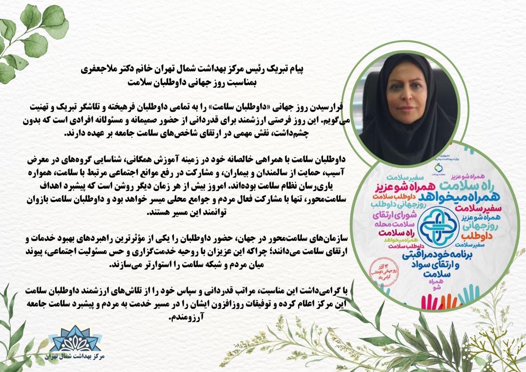 پیام تبریک رئیس مرکز بهداشت شمال تهران به مناسبت روز جهانی داوطلبان سلامت